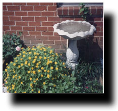 The BirdbathOne of the first things that we added after the installation of the garden was the birdbath. the birdbath is necessary for three reasons. One, it allows the little birds to take a drink and wash themselves off after a rough day of catching worms. Two, it allows our cats ample opportunity to attack and eat those birds without having to expend much effort. And three, it allows us to grow various types of fungus and algae in a semi-natural environment. |